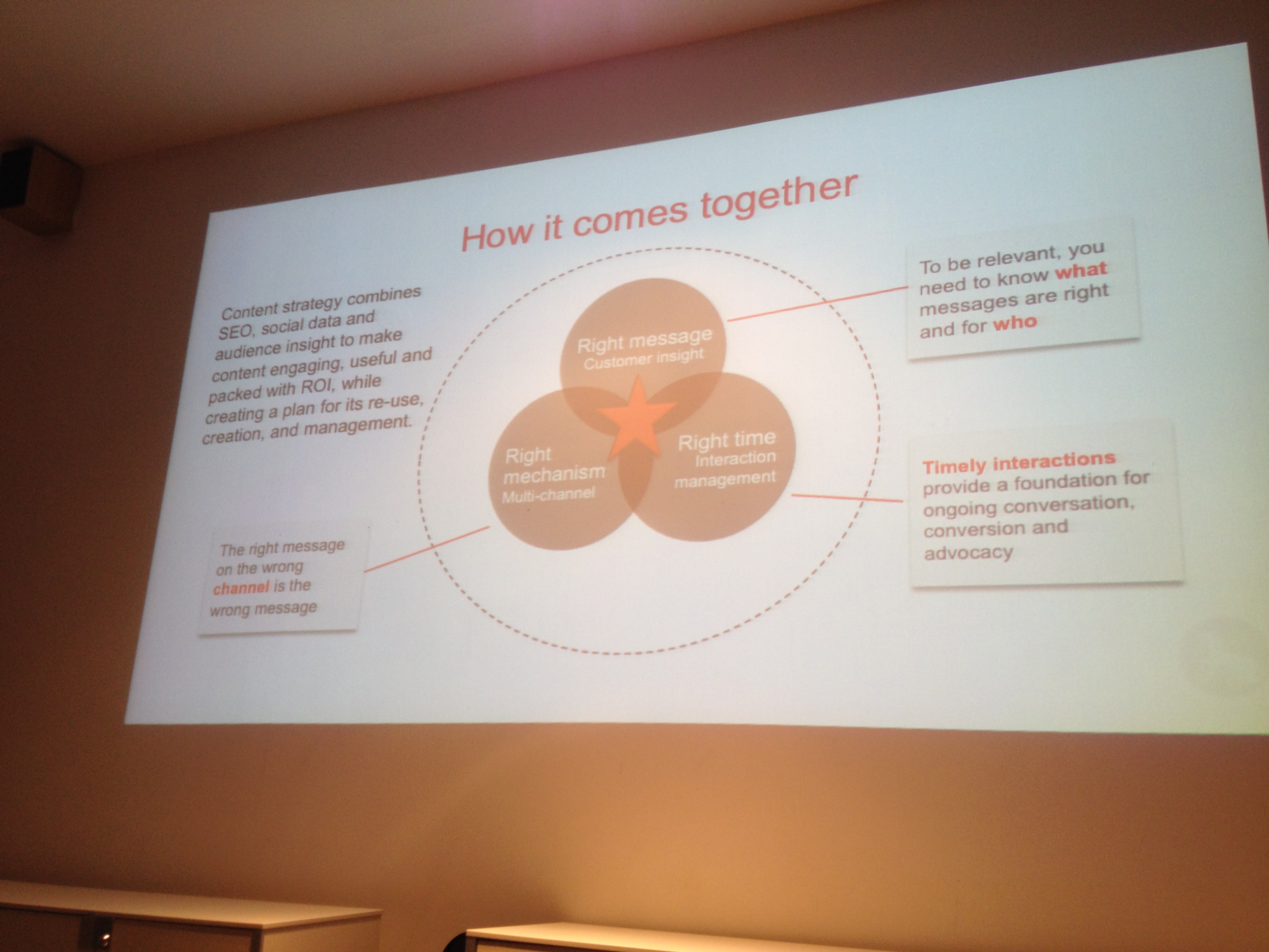 Ich habe mich besonders darüber gefreut, Elizabeth McGuane als Gastvortragende in London zu sehen. Sie ist gewissermaßen meine Wegbereiterin für die Beschäftigung mit Content Strategie: Ich hatte sie Anfang 2014 bei einer Konferenz in Wien kennengelernt. Elizabeth sprach damals darüber, warum viele Unternehmen Probleme mit ihrem Content haben. Anhand eines Content-Strategie-Prozesses beschrieb sie, wie Content Strategie hier helfen kann. In London hat uns Elizabeth viel über Content-Strategie-Prozesse in ihren Projekten erzählt, aber auch über den Zusammenhang von Content Strategie und User Experience Design.